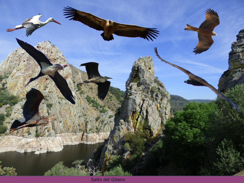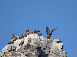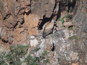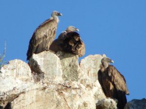 El plato fuerte sin duda son los buitres por su abundancia y por la facilidad de observarlos en sus nidos y en vuelo. Desde el observatorio del Salto del Gitano ( para mí el más importante) pueden observarse los nidos y en su época los polluelos de buitres, cigüeñas negras, alimoches…